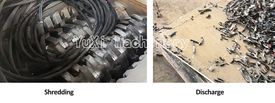 The shearing force is generated by the reverse rotation of two sets of independent knife shafts, and in combination with the fixed knife, a shearing gap is formed to achieve material shredding. The planetary reducer driven by dual motors provides power. During the meshing process of the knife teeth, tearing and squeezing effects occur. After multiple crushing, the material is discharged from the screen.