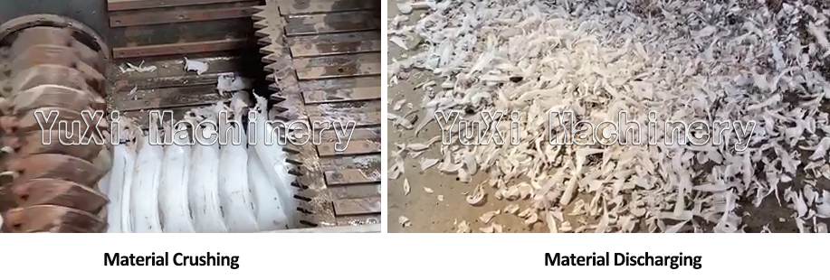 After the materials enter the box through the feeding system, the hydraulic pushing device pushes them to the blade area to ensure stable force application. The reduction motor drives the main shaft of the blade to rotate. The moving knife and the fixed knife work together to apply tearing, squeezing and shearing to the material, breaking it into small pieces. The small pieces of crushed materials are discharged through a custom-made screen